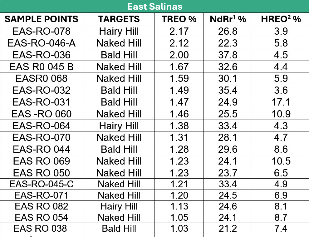 Rock chip sampling at East Salinas has returned multiple high-grade rare earth results (Figure 1), with three samples assaying above 2% TREO. Key intercepts include: