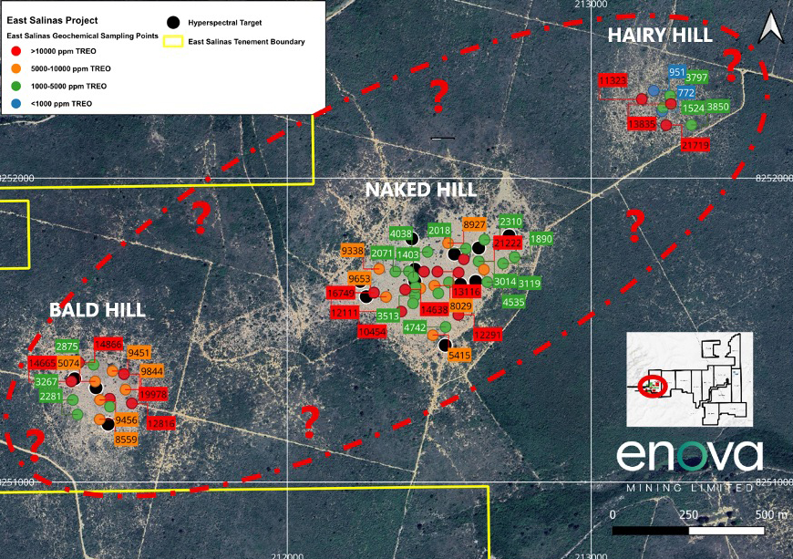 East Salinas complements Enova’s REE exploration portfolio alongside Juquiá, CODA North, and CODA Central. The project’s large-scale tenement coverage and its association with post-collisional granites present multiple zones of interest, including the Bald Hill and Naked Hill targets, supporting further subsurface investigations and resource delineation.