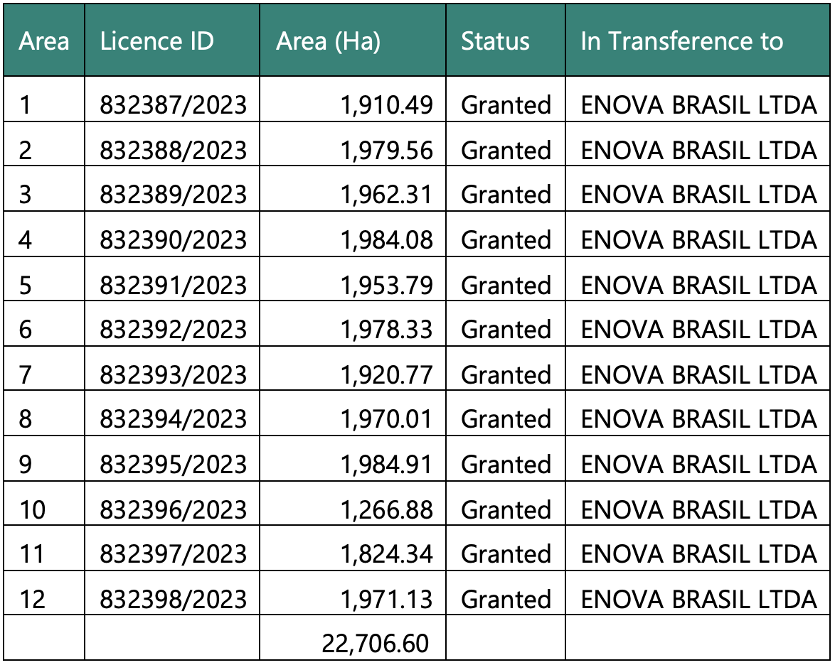 The East Salinas tenements are currently held by Mineração Paranaí Ltda and registered in the state of Minas Gerai. Upon completion of the permit in the official gazette, Mineração Paranaí Ltda will undertake the contractual process to transfer the title to Enova.  Details of the East Salinas tenements are outlined in Table 2 and illustrated in the inset of Figure 1.