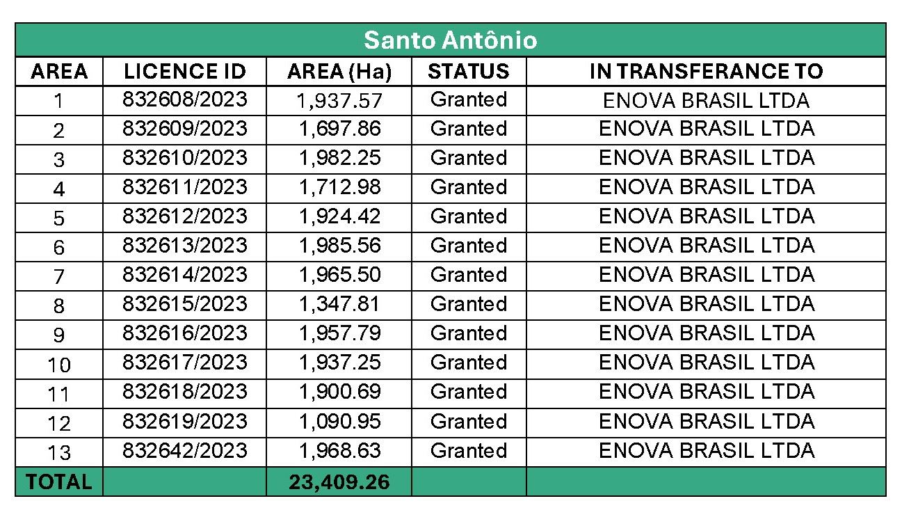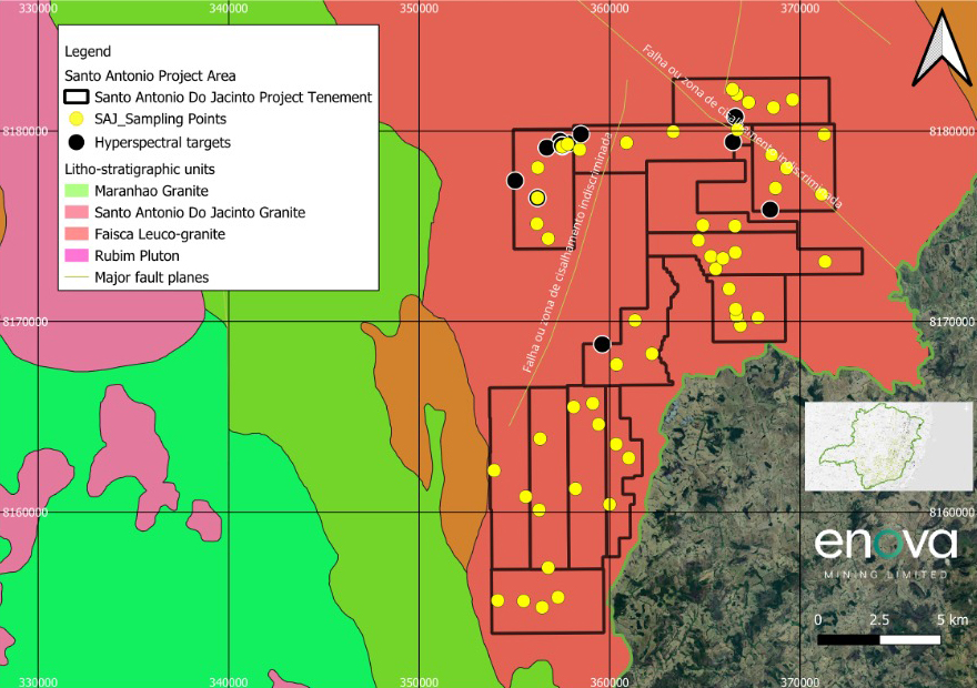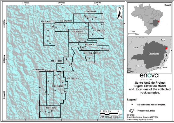 Enova has completed the first round of systematic geochemical sampling at Santo Antônio do Jacinto, collecting 52 rock chip samples across the entire tenement package - Extensive Tenement Coverage